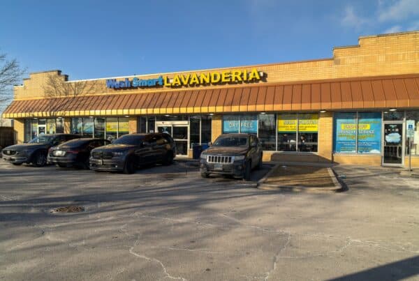 Exterior view of the Wash Smart Lavanderia in the Brighton Park neighborhood, featuring signage for free dry credits, free Wi-Fi, drop off laundry service, and kids zone.