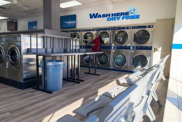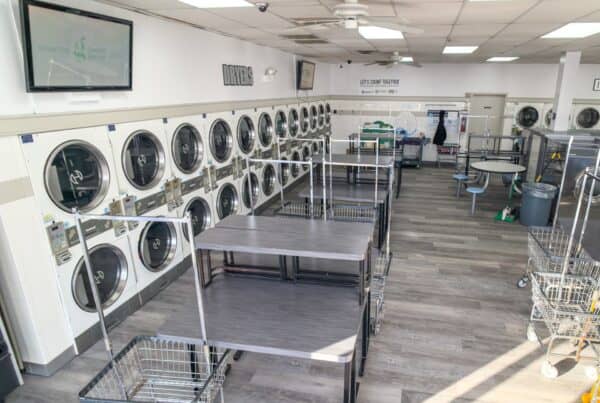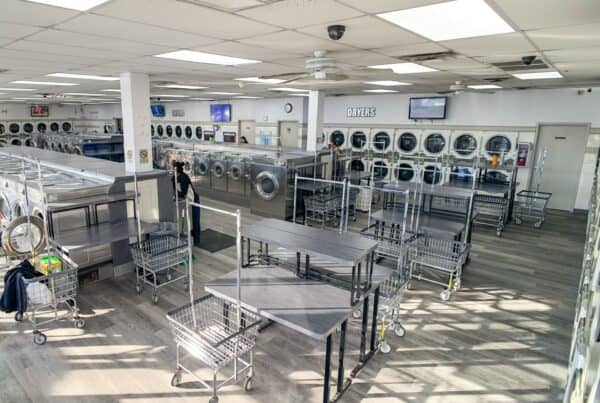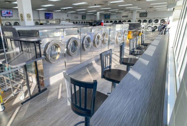 Spacious interior of Wash Smart Lavanderia in Brighton Park, featuring a row of high-capacity washers and customer seating. Folding tables and carts are readily available, creating a convenient environment for laundry day.