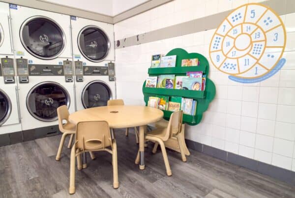 Family-friendly Kids Zone at Wash Smart Lavanderia in Brighton Park. Keep little ones engaged with books and activities while you handle your laundry.
