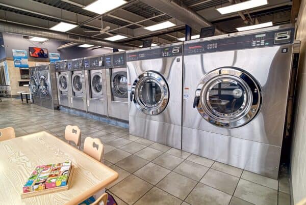 Spacious and family-friendly Wash Smart Laundry in Franklin Park, IL, featuring high-capacity Speed Queen washers and a dedicated kids' zone with activity tables for young visitors.