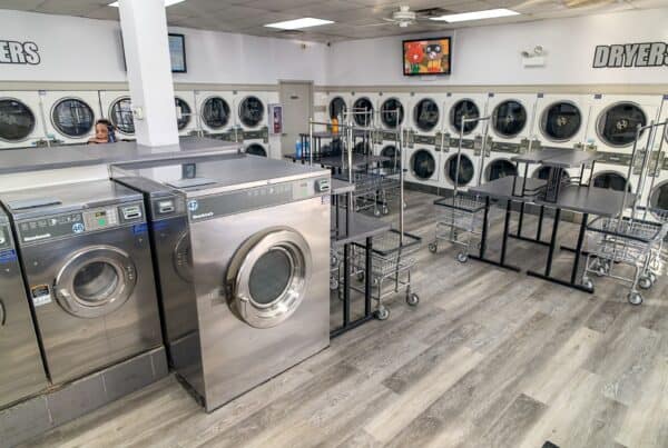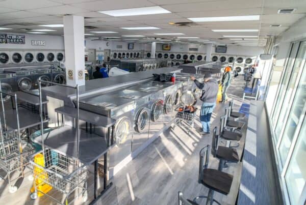 Spacious interior of Wash Smart Lavanderia in Brighton Park, featuring a row of high-capacity washers and customer seating. Folding tables and carts are readily available, creating a convenient environment for laundry day.